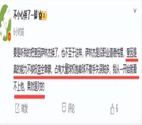 昨晚輸球與奎因外線瘋狂打鐵關(guān)系很大,球迷說他就是毒L,打亂了球隊節(jié)奏,給了廣州隊追分的機(jī)會??虿恢皇亲蛲砣绱撕颍麕缀鯃鰣龆际沁@樣打,把自己當(dāng)根蔥,實(shí)際就是一個浪投者。一位博主說,“要是聽我的把奎因薩林杰換了,也不至于這樣,薩林杰是沒職業(yè)道德純擺,奎因是真的能力不夠投籃全靠蒙,占有大量球權(quán)抱著球不撒手失誤賊多,我從一開始就看不上他,果然是對的。”