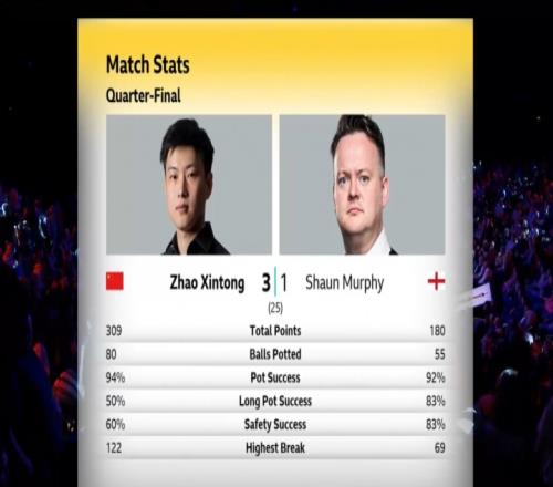比賽開場,趙心童打出單桿122分先聲奪人,第二局肖恩·墨菲打出單桿60分卻被趙心童完成逆轉(zhuǎn),隨后趙心童與墨菲各勝一局結(jié)束上半場,其中墨菲在第四局中打出單桿69分。