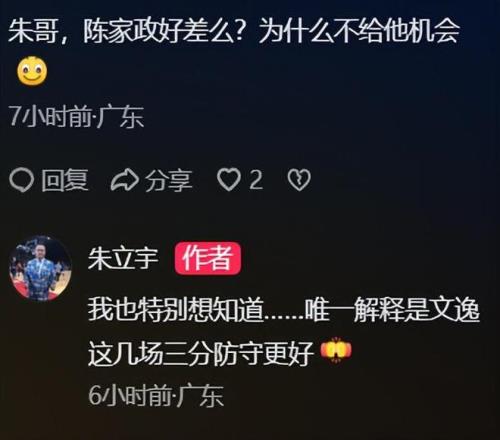 除了這個(gè)方面的原因外,關(guān)于陳家政無(wú)法上場(chǎng)還有另外一種解釋?zhuān)瑥V東臺(tái)知名解說(shuō)員“朱立宇”也發(fā)表了個(gè)人見(jiàn)解,有球迷在評(píng)論區(qū)問(wèn)朱立宇:陳家政表現(xiàn)好差么?為什么不給他機(jī)會(huì)?朱立宇回答:我也特別想知道...唯一的解釋就是張文逸這幾場(chǎng)的三分防守更好。
