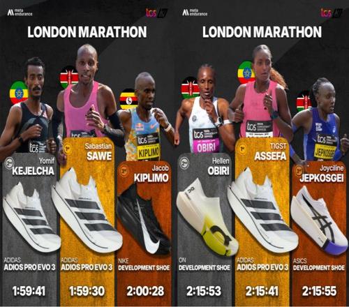 薩維和科杰查在倫敦穿著阿迪達(dá)斯Adizero Adios Pro Evo 3「破2」;男子第三名雅各布·基普利莫同樣打破此前賽會(huì)紀(jì)錄,他穿著的是耐克打造的 Alphafly尚未正式發(fā)布的原型鞋;女子第二名海倫·奧比里穿著On昂跑Cloudboom原型款,女子第三名Joyciline Jepkosgei穿著的則是亞瑟士Metaspeed系列原型款。