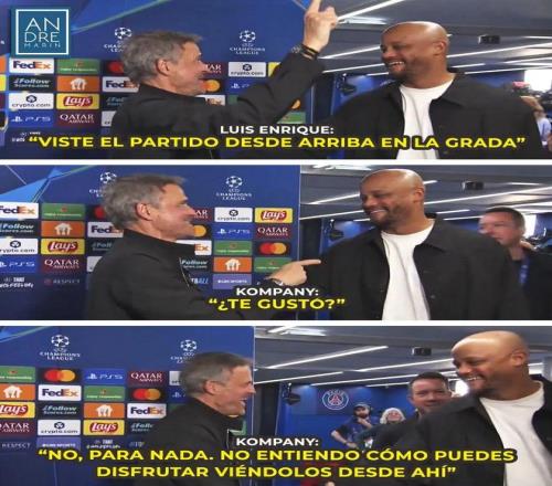 賽后兩位教頭相逢時的開懷大笑足以證明這個激情之夜的英雄相惜,恩里克調(diào)侃孔帕尼在看臺上觀看這一經(jīng)典對決感受如何,孔帕尼笑稱并不好玩,并反問恩里克為何會主動做出這一選擇(西班牙人曾多次在歐冠和法甲賽事中主動選擇上看臺指揮,并表示那樣能夠獲得全局視野)?