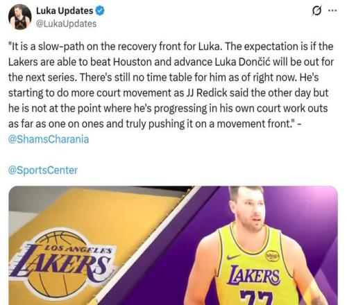 同時Shams指出東契奇的傷病恢復并不理想,在恢復方面十分緩慢,目前的預期是湖人隊擊敗火箭進入次輪,東契奇也將缺席接下來次輪對陣雷霆的系列賽。