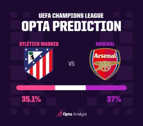 Opta超算預(yù)測:阿森納首回合獲勝概率37%,高于馬競的35.1%