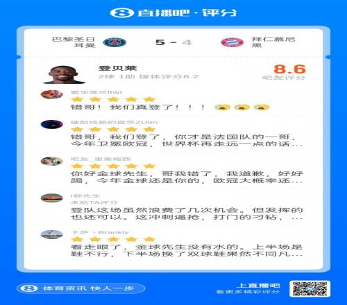 賽后超萬(wàn)名吧友為登貝萊打出8.6評(píng)分,吧友熱評(píng):錯(cuò)哥!我們真登了!金球先生沒有水的