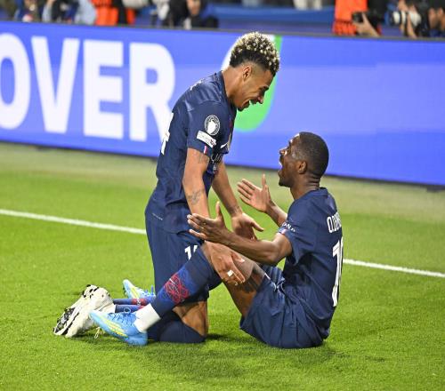 登貝萊下半場進(jìn)球后與杜埃慶祝,球鞋已經(jīng)換成了藍(lán)色
