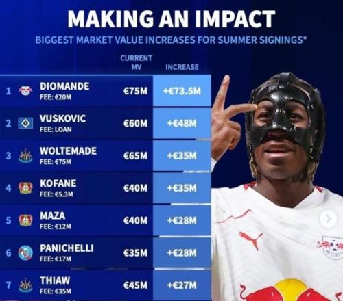 而如今,根據(jù)德國轉(zhuǎn)會市場最新身價(jià)數(shù)據(jù)顯示,揚(yáng)迪奧曼德的身價(jià)已經(jīng)暴漲至7500萬歐元,僅僅一個(gè)賽季,凈資產(chǎn)增值五倍。在德轉(zhuǎn)列出的25/26賽季身價(jià)漲幅榜上,迪奧曼德以7350萬歐元的夸張數(shù)據(jù),成為本賽季世界足壇身價(jià)漲幅最高的球員。