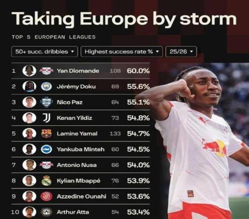 本賽季德甲賽場上,揚(yáng)迪奧曼德場均成功過人接近4.2次,成功率62.7%,毫無爭議的德甲過人王。而整個(gè)歐洲的所有邊鋒中,迪奧曼德的成功過人次效率值,穩(wěn)穩(wěn)位列99%的頂尖百分比,漸進(jìn)式帶球與禁區(qū)觸球分別處于97%與93%的極限高位,射門創(chuàng)造行動更是站到了92%的黃金門檻之上。每一個(gè)看過迪奧曼德比賽的球迷,都能從他的盤帶中感受到那種恐懼般的不確定性,慣用右腳的科特迪瓦少年,左腳同樣細(xì)膩到令人窒息,防守球員永遠(yuǎn)猜不到下一秒他會內(nèi)切還是走外線。