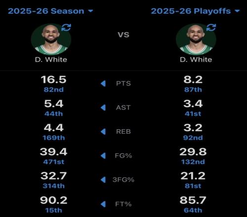 德里克懷特本賽季常規(guī)賽VS季后賽數(shù)據(jù):得分減半命中率變更差