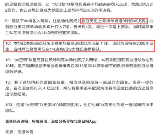 有些文章稱這場5-4是歐冠半決賽史上第一場進球數(shù)達到9個的比賽,且距離歐冠淘汰賽單場最多進球紀錄只差1球。如果它確認不是忘記了加“改制后”,則顯然二者都是謬誤。