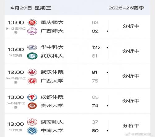 2025-2026全國大學(xué)生籃球一級(jí)聯(lián)賽西南賽區(qū)的半決賽今日在湖南株洲落下帷幕,華中科大和中南大學(xué)均以較為懸殊的分差戰(zhàn)勝對(duì)手,順利會(huì)師將在明日舉行的決賽。武漢科大和湖南師大也將在明天進(jìn)行3、4名的爭(zhēng)奪。