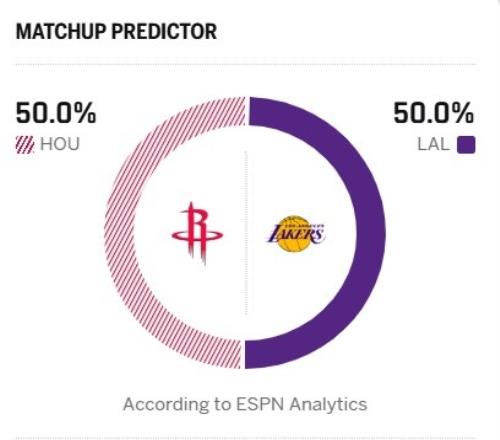 ESPN預測本場比賽勝率:湖人50%,火箭50%。