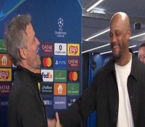 4月29日凌晨,比賽結(jié)束后,巴黎圣日耳曼主帥路易斯·恩里克走向了拜仁慕尼黑主帥文森特·孔帕尼。由于此前的禁賽處罰,孔帕尼本場(chǎng)比賽只能在看臺(tái)上觀戰(zhàn)。