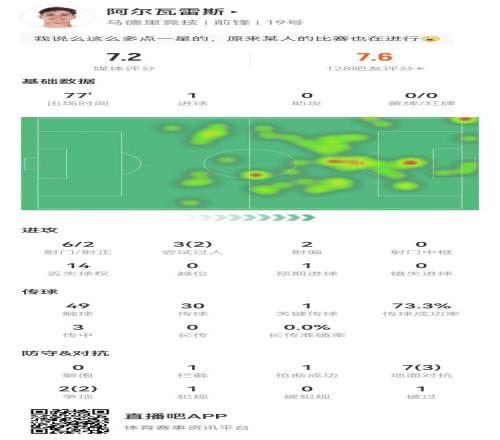 體育播報(bào)4月30日宣 馬競(jìng)在本輪歐冠對(duì)陣阿森納,阿爾瓦雷斯本場(chǎng)數(shù)據(jù)如下: