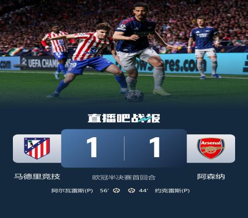 體育播報4月30日宣 北京時間3:00,歐冠半決賽首回合馬德里競技vs阿森納,比賽在大都會球場打響!上半場,阿爾瓦雷斯遠射造險,拉亞獻神撲;厄德高失良機;約克雷斯造點后親自主罰破門!下半場,本·懷特手球送點,阿爾瓦雷斯點射扳平!格列茲曼中橫梁!盧克曼錯失絕佳機會;阿爾瓦雷斯傷退!埃澤倒地,漢茨科再送一點,主裁回看VAR取消點球判罰。最終,雙方首回合在馬競主場1-1戰(zhàn)平,次回合雙方移師酋長球場再戰(zhàn)!