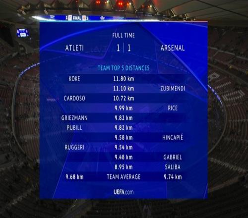 馬競平均跑動9.68公里,阿森納平均跑動9.74公里