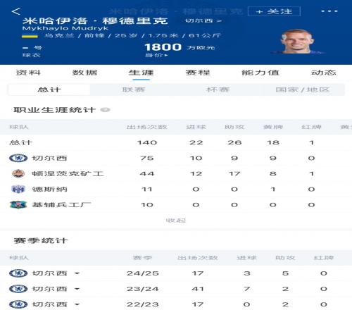 據(jù)德轉(zhuǎn)數(shù)據(jù),穆德里克2023年1月以7000萬歐的轉(zhuǎn)會(huì)費(fèi)加盟切爾西,自2024年11月參加歐協(xié)聯(lián)比賽后,就再未代表切爾西出場。目前穆德里克的身價(jià)僅剩1800萬歐元。
