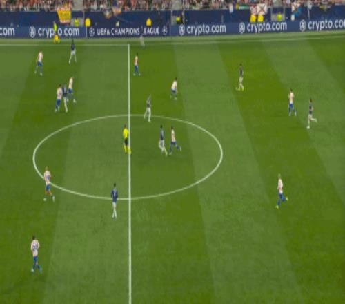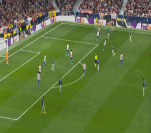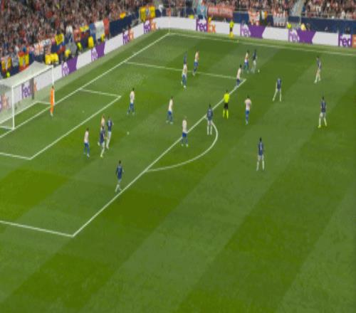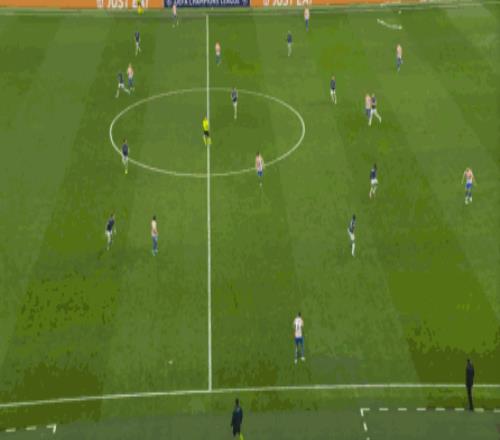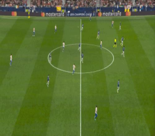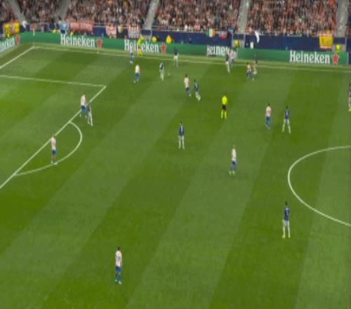 這一點的確是可用的優(yōu)勢,但光有跑動,沒有沖擊,進攻就會缺乏向前的速度,也難以制造更多的空間,所以在開局階段,馬競的確打得比較主動,但到了禁區(qū)附近,當盧克曼和格列茲曼在左右兩側試圖和隊友打出缺口的時候,就會遭遇身體層面的屏蔽: