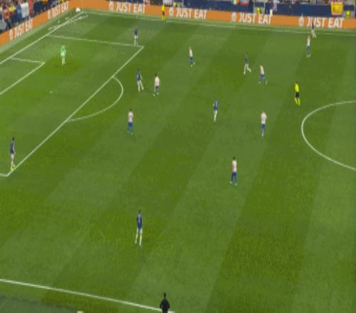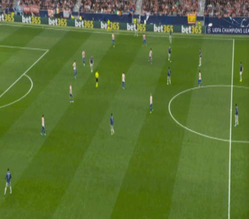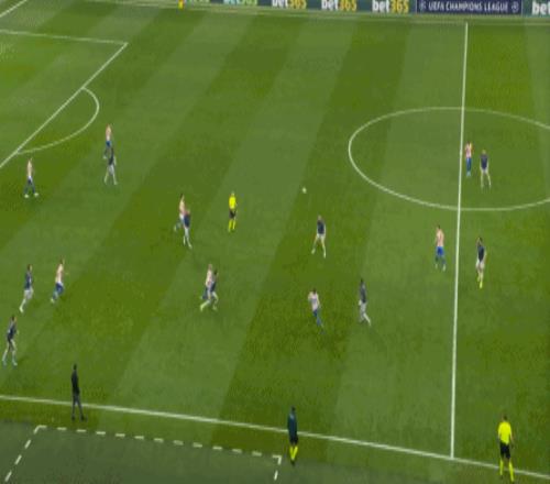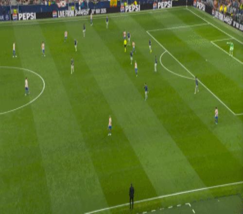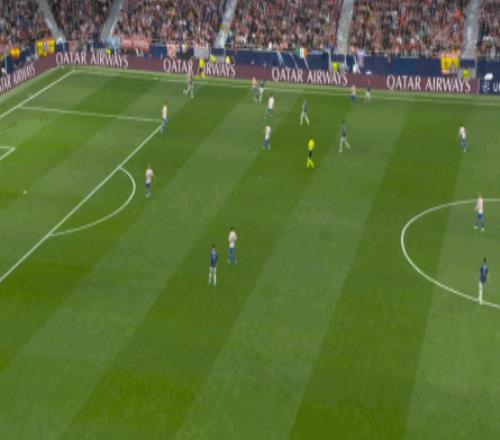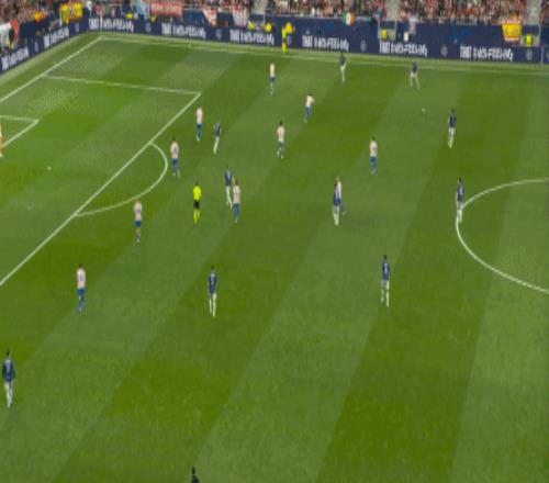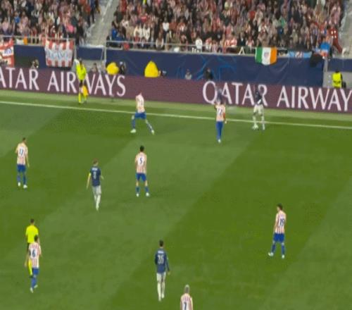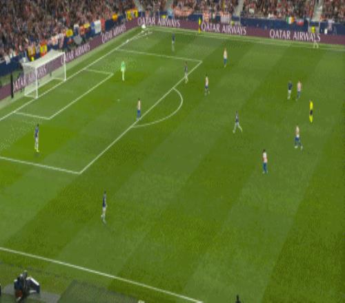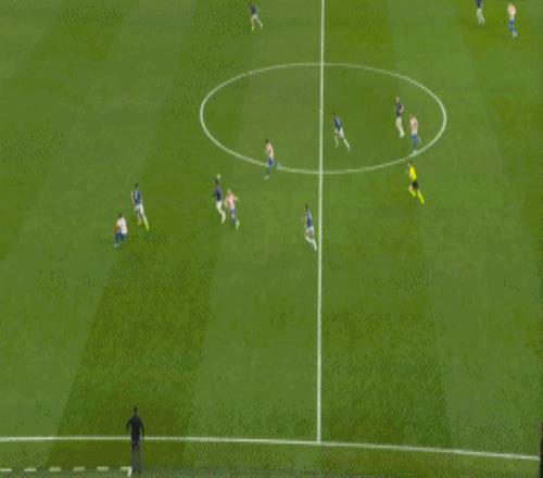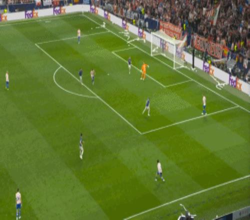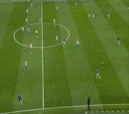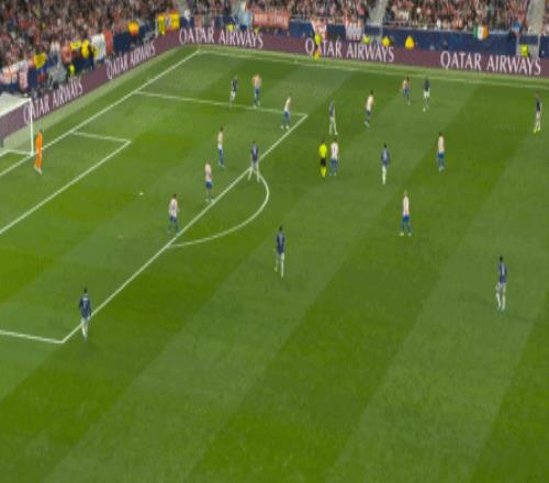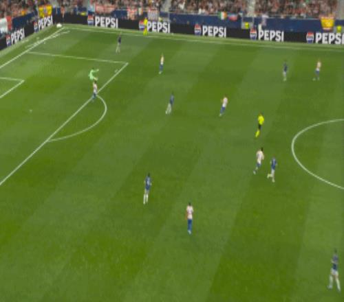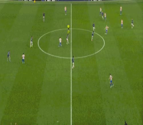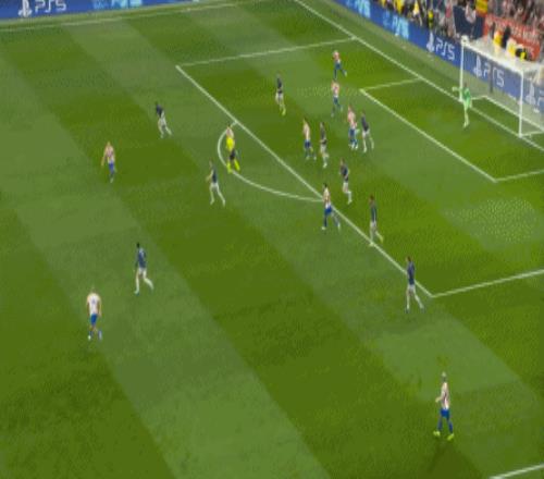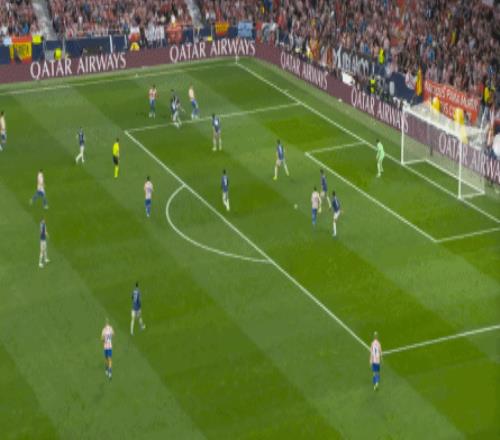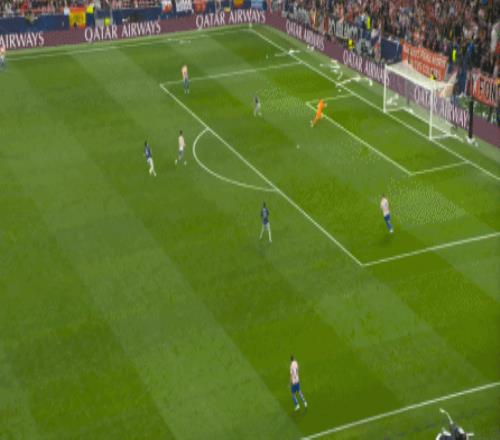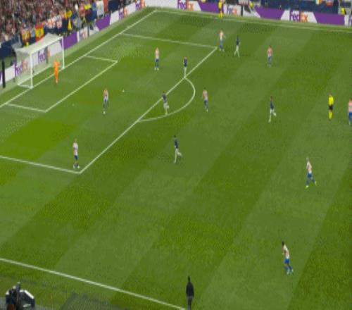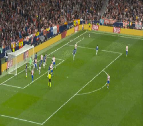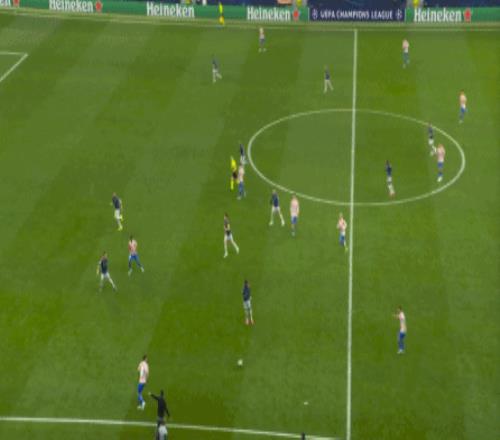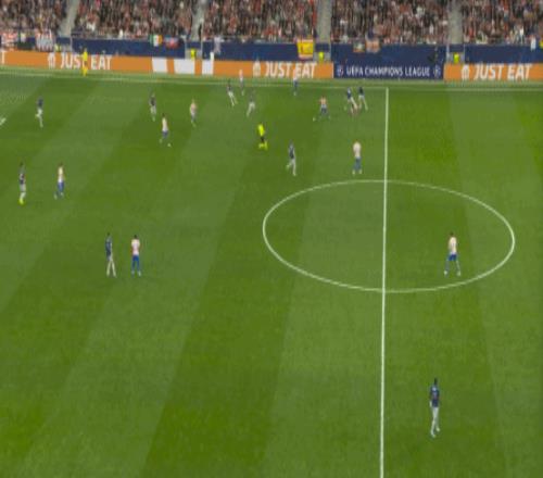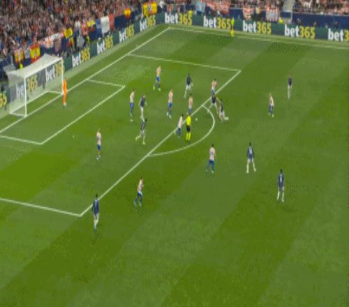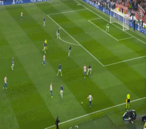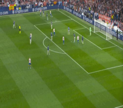 甚至在第53分鐘,馬競一次后場大腳,直接找到格列茲曼,后者在薩利巴身前用頭一頂,便為阿爾瓦雷斯制造了向前沖擊的球權和空間: