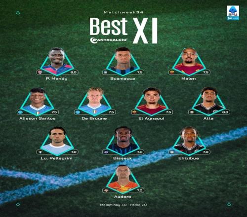 意甲第34輪最佳陣:德布勞內(nèi)領銜,比塞克、馬倫、斯卡馬卡在列