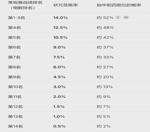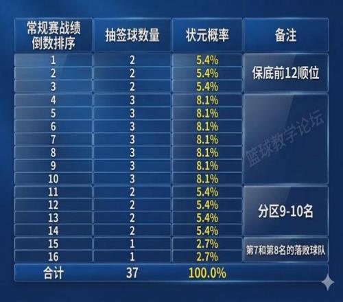 上面這張圖很清楚,即便擺爛成聯(lián)盟倒數(shù)第一也沒意義,狀元簽概率還不如聯(lián)盟倒數(shù)第10高。這個規(guī)則針對性很強(qiáng),肖華就是在打擊擺爛球隊!聯(lián)盟墊底的三支球隊唯一好處是保底能抽到12順位,其他13支球隊最差是抽到第16順位。