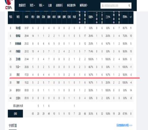在12進8首輪浙江男籃65-57寧波男籃的比賽中,吳前全場三分6中1,僅為球隊貢獻4分,正負值-3,為全隊倒數(shù)第三。