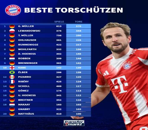 根據(jù)德轉(zhuǎn)的數(shù)據(jù)統(tǒng)計,在打進這粒進球后,凱恩已經(jīng)總計為拜仁打進139粒進球,排在拜仁隊史射手榜第10位。