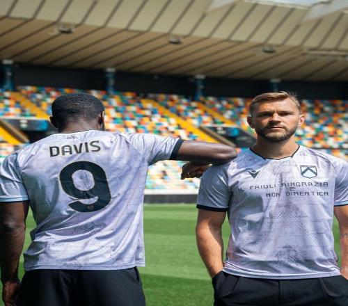 球衣采用石灰色為基調(diào),面料上印有升華圖案,模擬了文佐內(nèi)大教堂的石材紋理。這座地標性建筑在1976年地震中被毀,之后通過逐塊復(fù)原原始石材而重建,成為弗留利人民堅韌精神與災(zāi)后重建的最重要象征之一。此外,球衣還保留了復(fù)古徽章,并在袖口采用不對稱設(shè)計,右袖全黑以示哀悼。