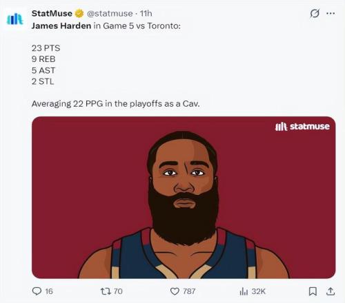 此役哈登全場(chǎng)比賽40分鐘,13中7,三分8中4,罰球6中5,拿到23分9籃板5助攻2搶斷1蓋帽,命中率53.8%,三分命中率50%,真實(shí)命中率73.5%,正負(fù)值+10。(此役米切爾17中7只拿19分,莫布利13中8拿23分)