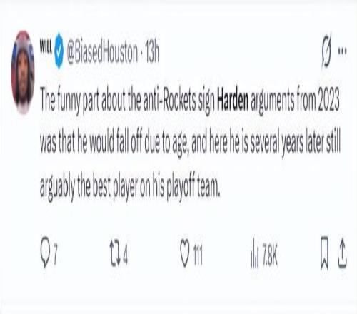 休媒Will也被哈登打服,他表示:關(guān)于2023年有人反對(duì)哈登回到休斯頓的觀點(diǎn),他的年齡過(guò)大無(wú)法再季后賽的舞臺(tái)延續(xù)表現(xiàn),但幾年過(guò)去了,他依舊是他所在球隊(duì)季后賽最出色的那個(gè)。