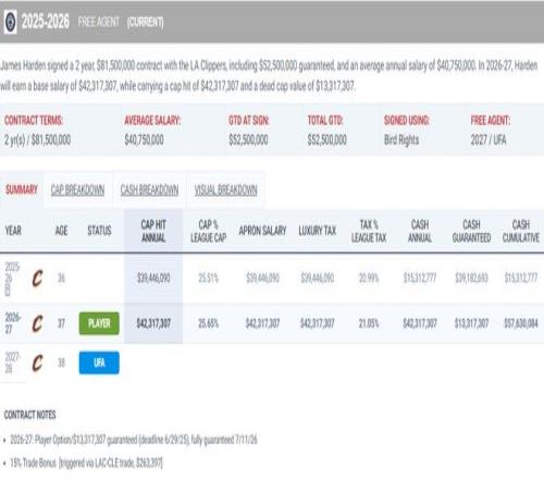 哈登下賽季合同是4231萬(wàn),但保障部分只有1330萬(wàn),他有意跳出合同跟騎士重簽一份兩年7500萬(wàn)的長(zhǎng)約,哈登這個(gè)表現(xiàn)絕對(duì)配得上這樣額度的合同,均薪才3750萬(wàn)遠(yuǎn)低于頂薪。
