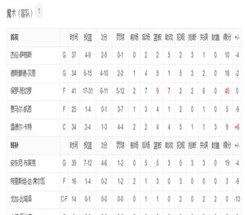 3.魔術(shù)季后賽得分榜班凱羅45分隊(duì)史第二;