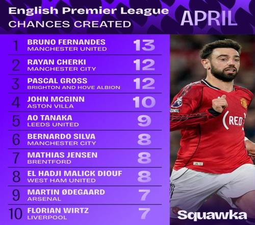 北京時(shí)間4月30日,知名數(shù)據(jù)機(jī)構(gòu)Squawka列出了英超4月的創(chuàng)造機(jī)會(huì)榜,曼聯(lián)中場(chǎng)布魯諾-費(fèi)爾南德斯以13次位居榜首,曼城的謝爾基和布萊頓的格羅斯以12次位列第二。