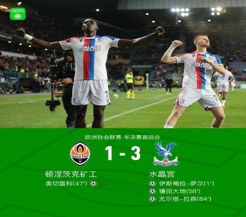 北京時(shí)間5月1日歐洲協(xié)會(huì)聯(lián)賽 半決賽首回合,頓涅茨克礦工對(duì)陣水晶宮。頓涅茨克礦工奧切雷科破門。水晶宮伊斯梅拉-薩爾破門,鐮田大地破門,尤爾根-拉森破門。最終比分頓涅茨克礦工 1-3 水晶宮。